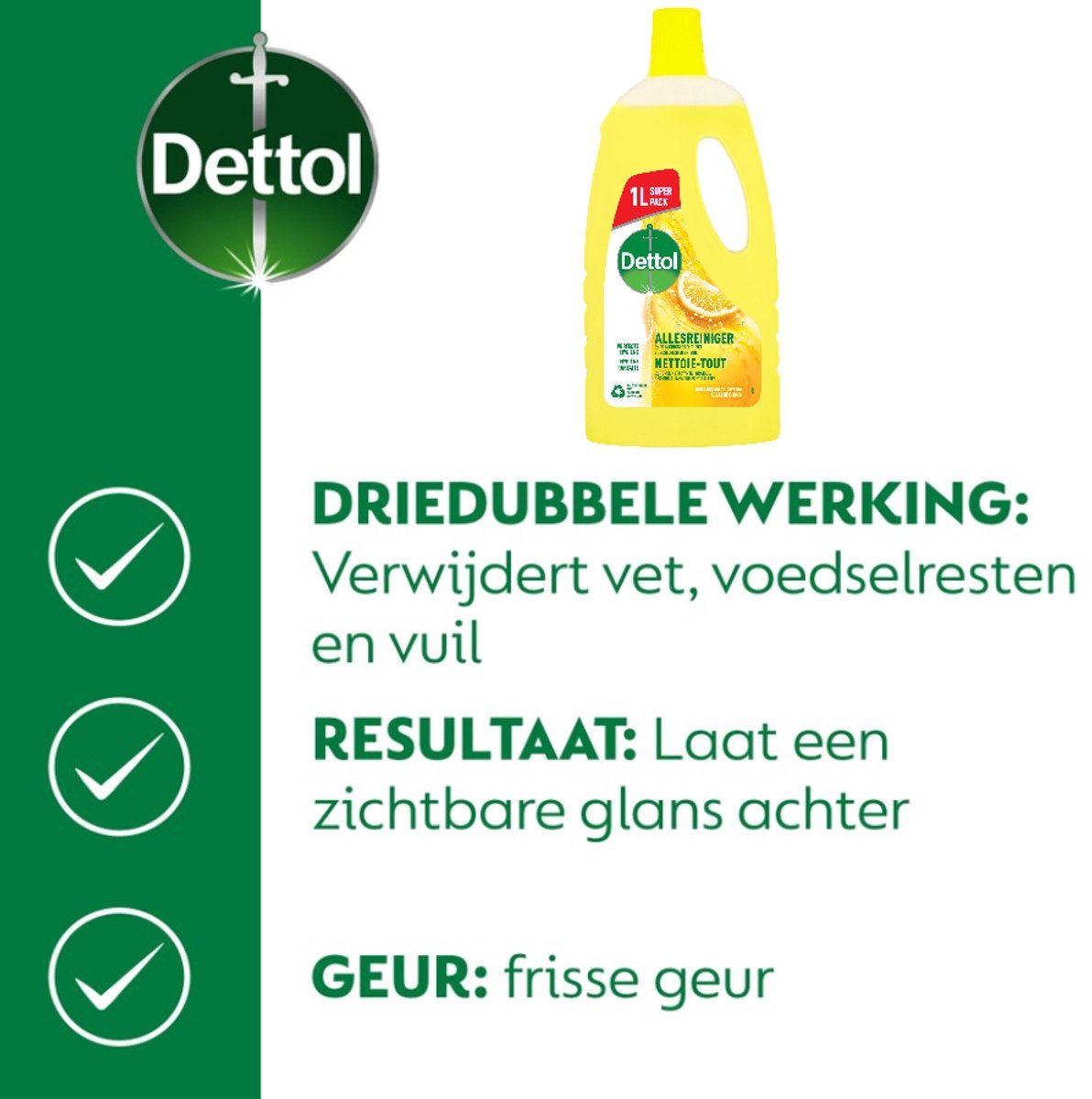 Met de Dettol Allesreiniger Sprankelende Citroen houd je jouw woning hygiënisch schoon en fris, elke dag opnieuw. De krachtige driedubbele werking verwijdert moeiteloos vet, voedselresten en hardnekkig vuil, waardoor oppervlakken niet alleen schoon zijn, maar ook zichtbaar glanzen. Dankzij de effectieve reinigingsformule is deze allesreiniger geschikt voor alle harde en afneembare oppervlakken, zoals vloeren, werkbladen en tegels.